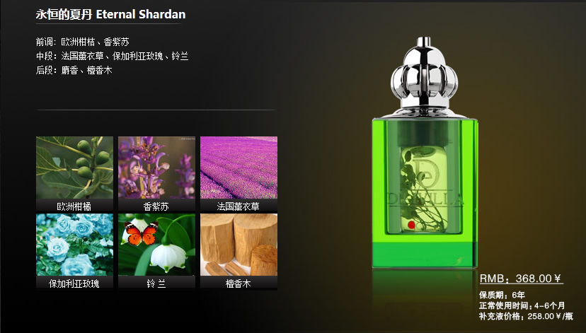 永恒的夏丹如同夏丹的画作一般对细节精益求精,从细节处传达生活的品质,精确地成分配料掌控,让每一缕幽香为心灵做一次SPA。让您在行车途中时刻品味尊贵生活。
